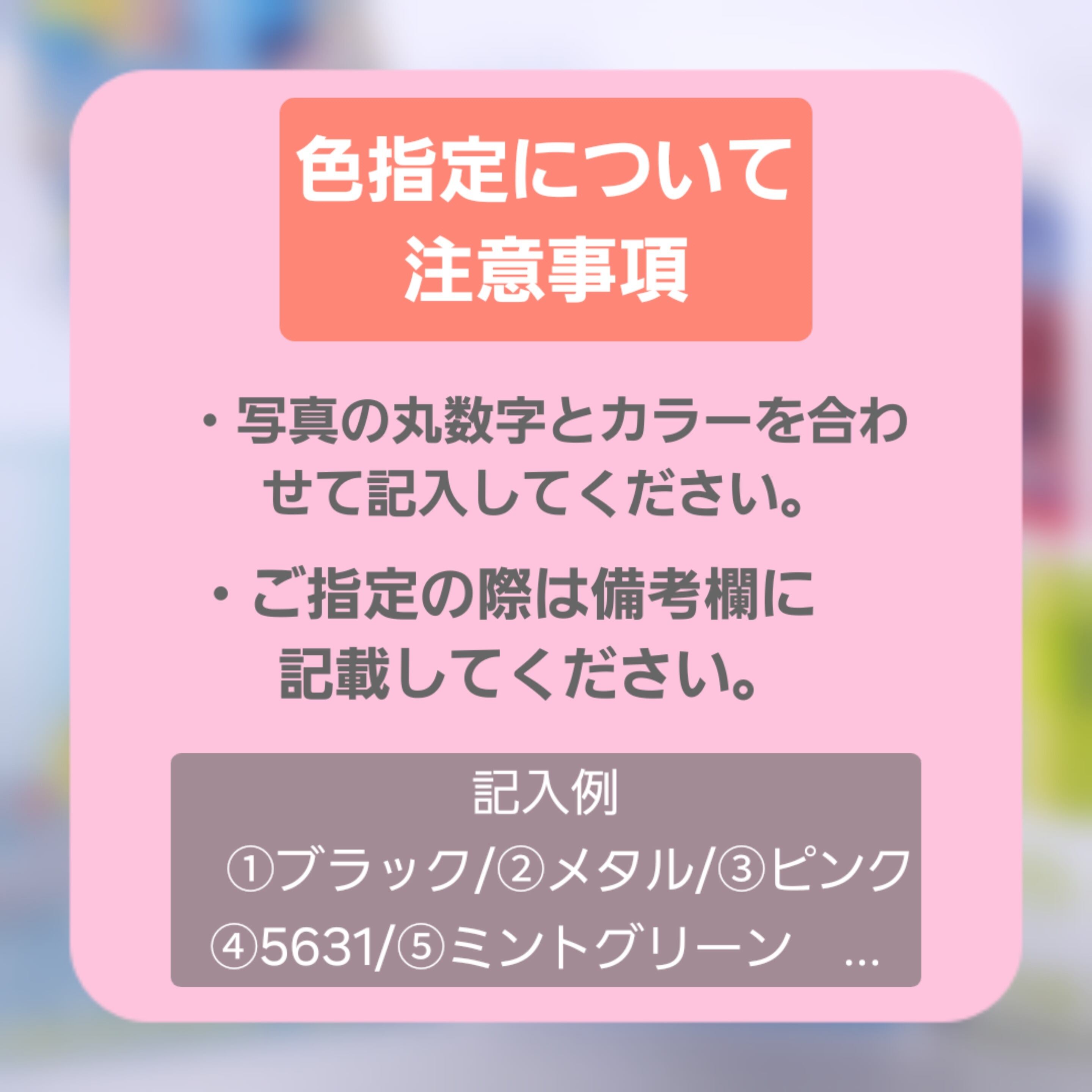 【重要!】お色をお客様の方で選ばれる場合には、注文時のメッセージにご記入いただくか、お問い合わせフォームまで注文から1時間以内にお知らせください。ご指定の方法は、写真の丸数字とカラーを合わせてご記載ください。お色のご指定がない場合にはこちらでランダムにお選びいたします。
